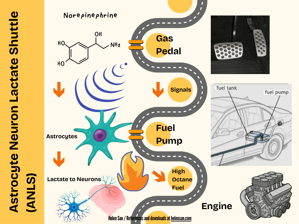 If the decision is yes, the task is worth the effort, NE signals astrocytes to release lactate as a fuel boost. It can be compared to a gas pedal, telling the fuel pump to dispense fuel to the engine. Astrocytes can be compared to the fuel pump that receives the signal. In ADHD, it is hypothesized that the signals from the gas pedal to the fuel pump are weak or delayed, which results in the high-octane fuel being delivered in fits and starts.