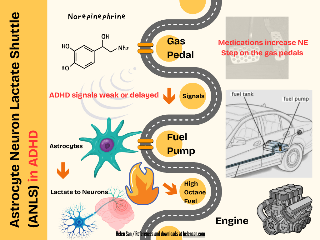 The Neuroenergetics Theory of ADHD (Killeen et al., 2013) identifies the Astrocyte-Neuron Lactate Shuttle (ANLS) (Pellerin & Magistretti, 2011) as being different in ADHD brains. The ANLS is hypothesized as a fuel system starting with norepinephrine signals to astrocytes, which then signal the release of lactate to neurons to support energy-intensive cognitive processing.
