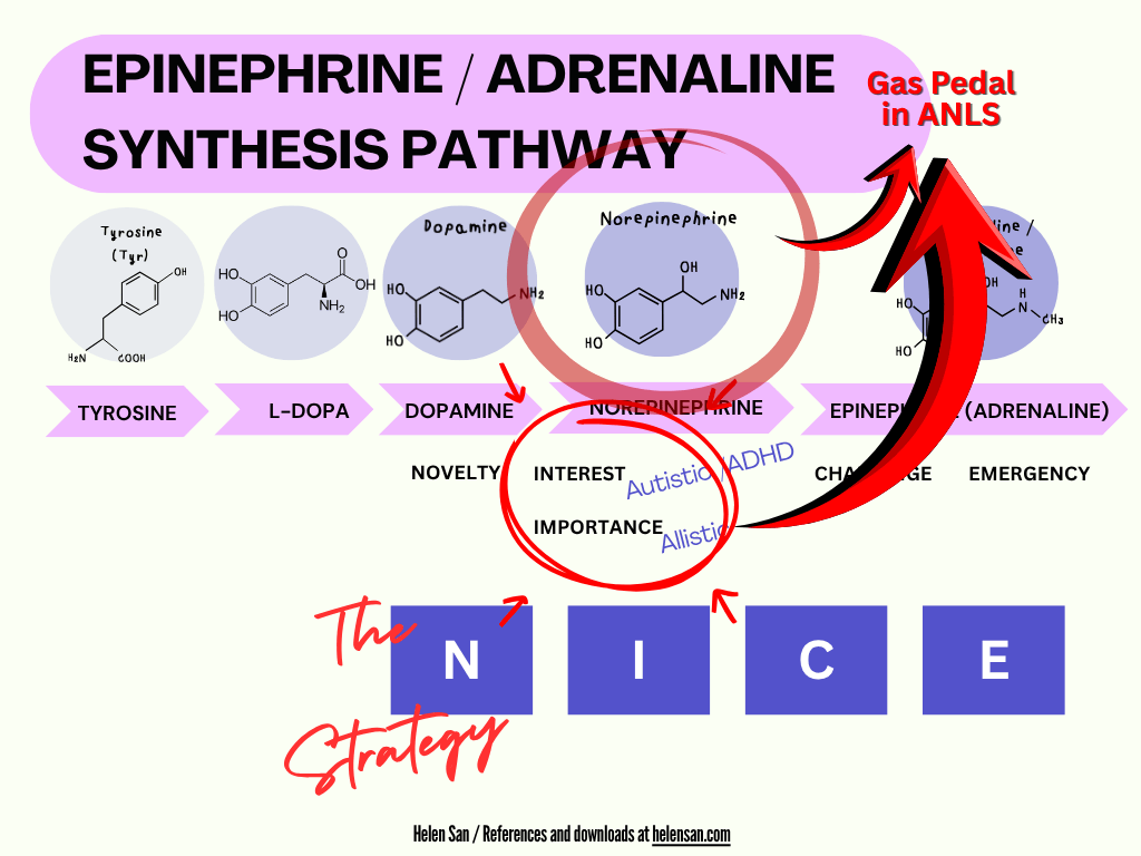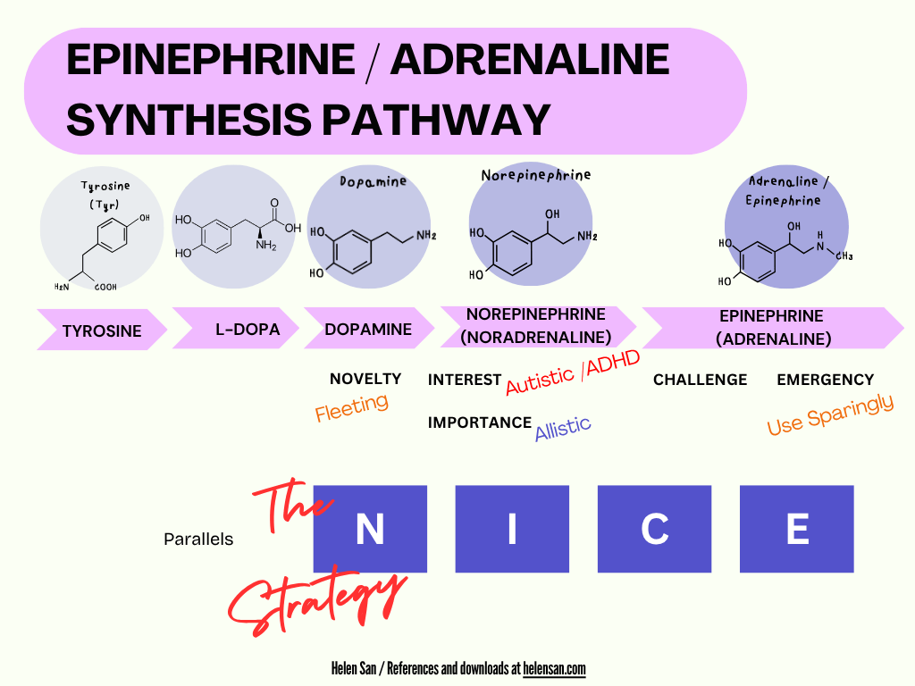It is well-known that ADHD brains respond best to tasks that have novelty, interest, challenge, and emergency, task characteristics that lend themselves to the acronym NICE. The NICE strategy can be thought of as a parallel the epinephrine synthesis pathway, with novelty corresponding to dopamine, interest to NE, and challenge and emergency to epinephrine. (Challenge, including dealing with adaptation and difficulties, actually corresponds to NE as well as to epinephrine.)