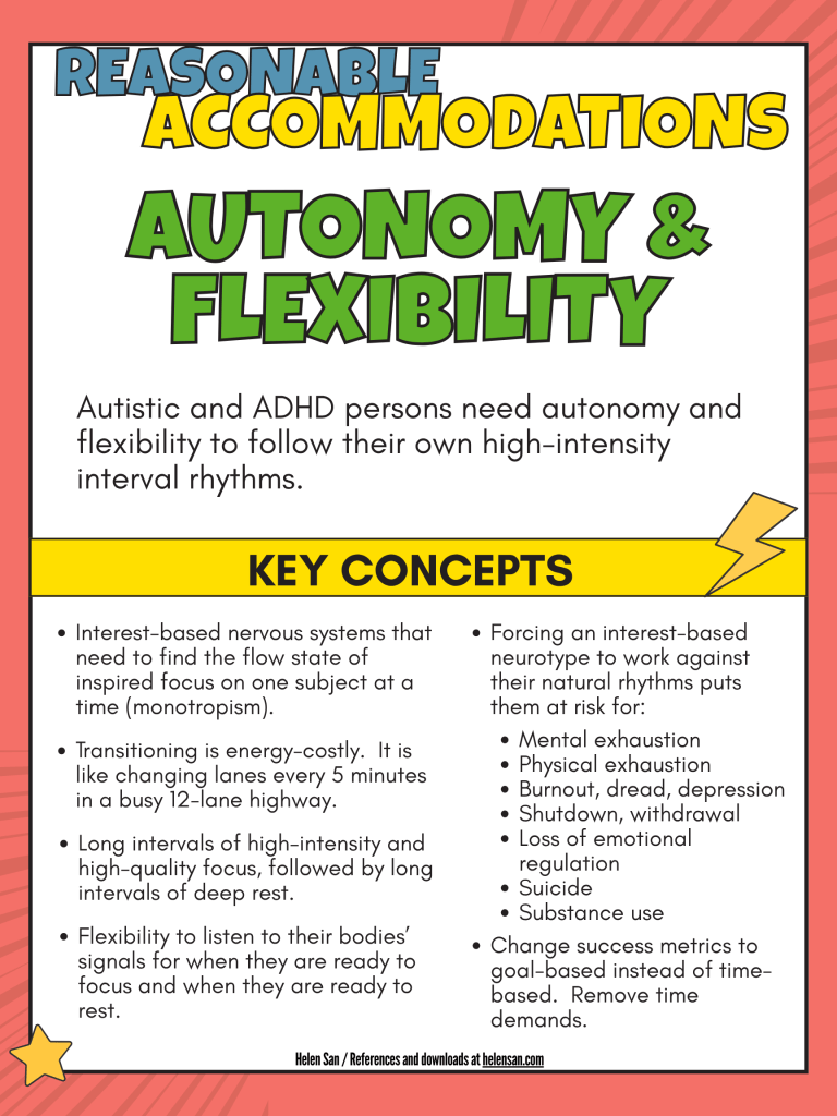 A reasonable accommodation for interest-driven neurotypes is to allow people to find their own flow states of productivity, the flexibility for them to respond to their own bodies’ signals for rest and work, and to build their own interest into the tasks they choose. Not allowing this accommodation can result in burnout, exhaustion, and deteriorating mental health.