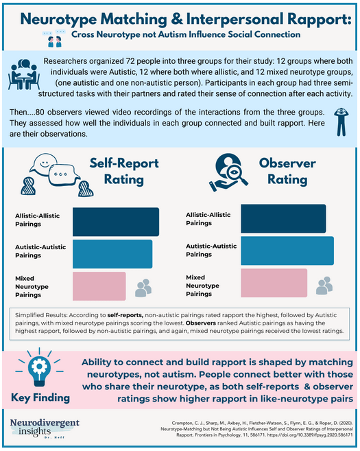 Dr. Megan Neff’s (neurodivergent_insights) infographic on Crompton et. al.’s study on double empathy says it all. This empirically demonstrates that rapport in same neurotype interactions is significantly higher than rapport in cross-neurotype interactions. What is surprising is that, to third parties watching, autistic-autistic interactions appear to have the highest rapport of all. We don’t have a problem socializing. We only have problems socializing with mismatched neurotypes–and they with us–and it’s ok.