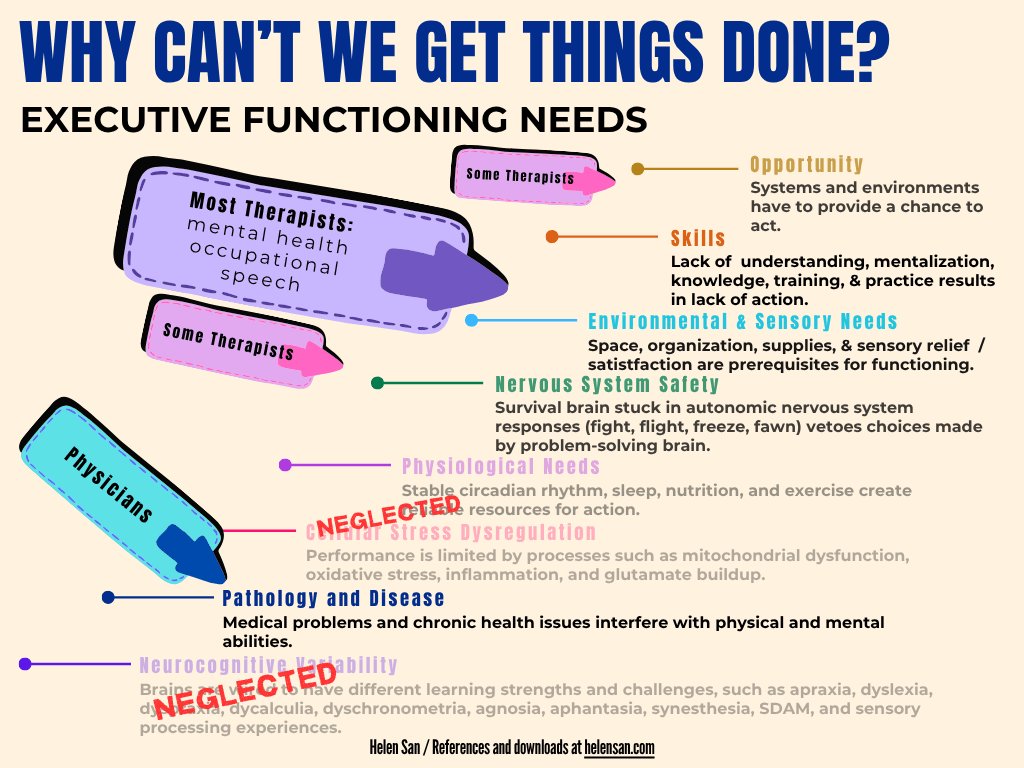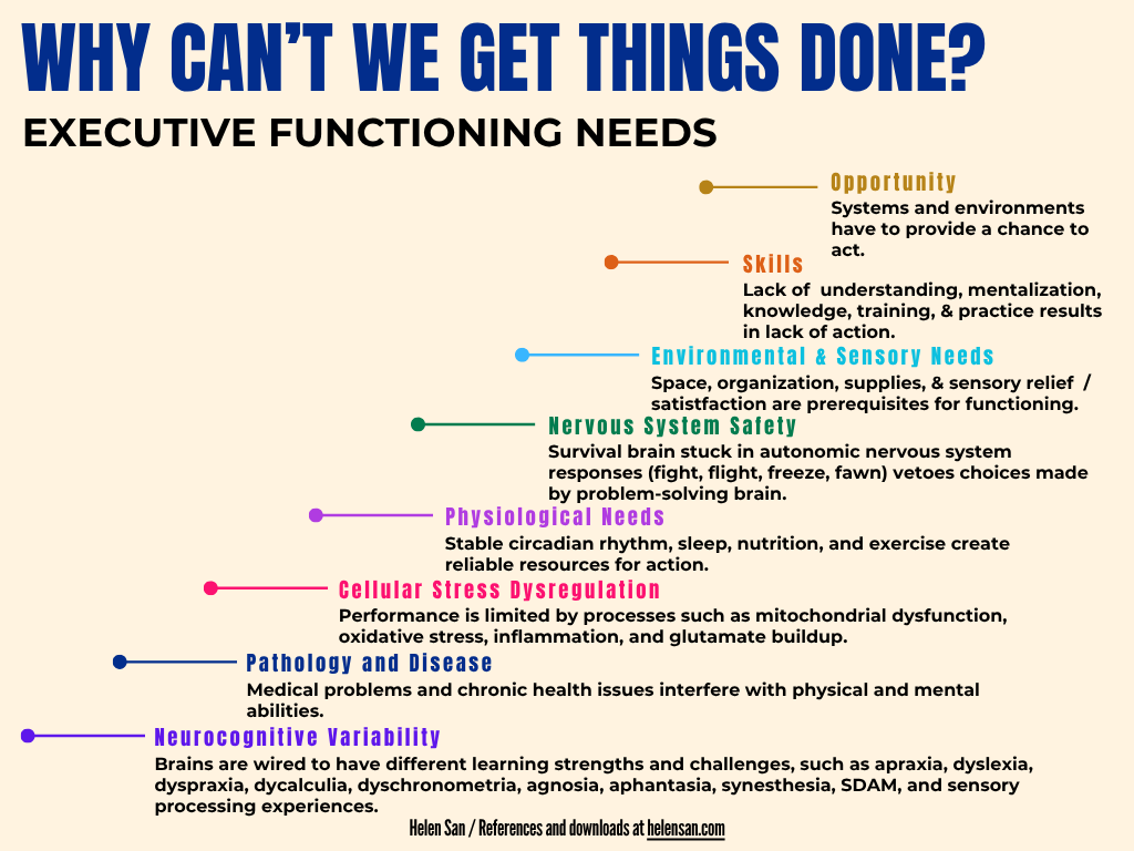I venture that the answer to “Why can’t we get things done” is that many needs for executive functioing are not met through lack of understanding and neglect, both by professionals and individuals themselves. And sometimes that understanding includes changing what we expect ourselves to do.