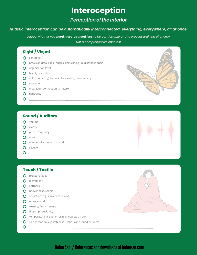 Interoception is awareness of what is going on inside the self. It is automatically interconnected with the environment outside, and with all the domains inside as well. With allistics, sometimes interoception is just being aware of heart rate and breathing, of hunger and thirst, of bathroom needs, and of emotions and their connection to the body. With Autistics, interoception can become extremely complex, with sensory hypo and hyper-sensitivities, drive for creativity and data processing, and difficulty distinguishing the many nuances of emotions. In Autistics, any one of these items that present as too much or too little can be a source of energy drain and dysregulation. Many of these items put together can exert a cumulative drain on the system.