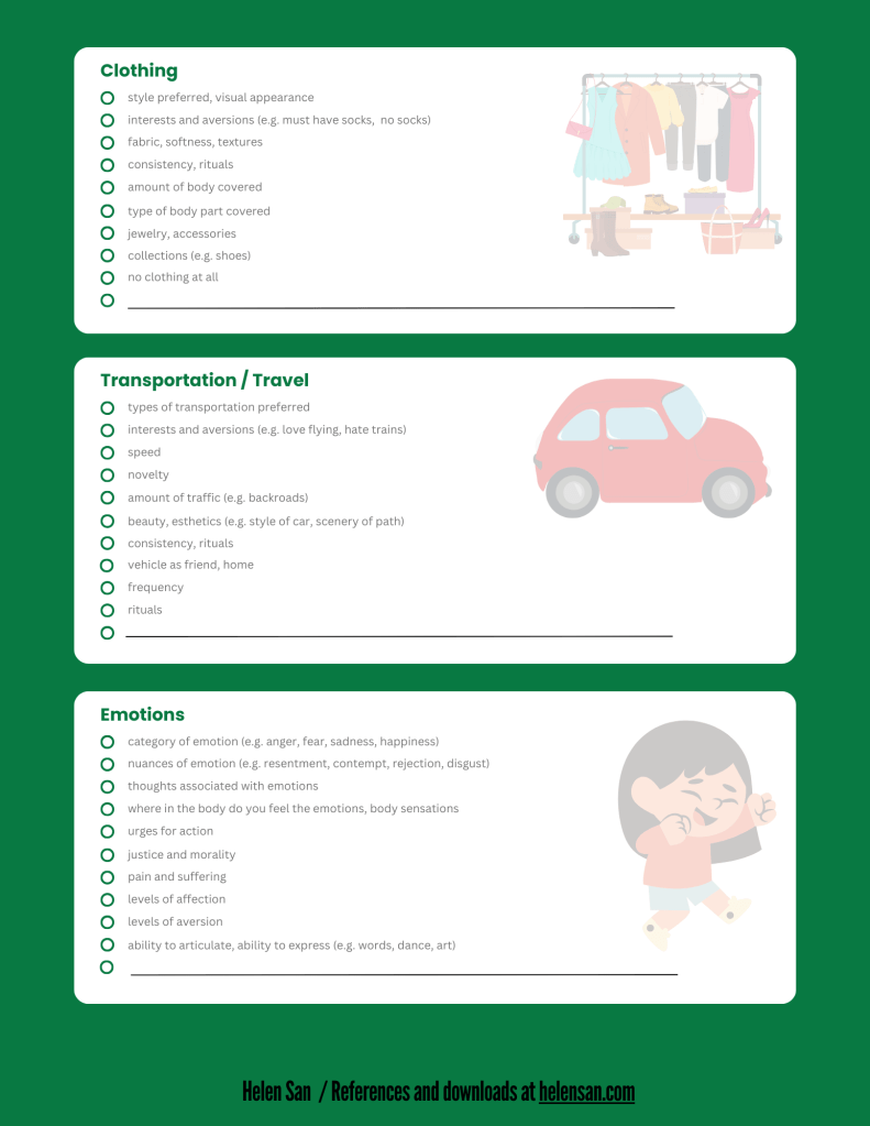 Below is a checklist of various interoceptive data points to gauge whether one needs more or less of each item. The checklist is there to illustrate how much data is being considered, rather than to serve as a comprehensive list. Please feel free to add your own items or make your own list using this as a springboard.