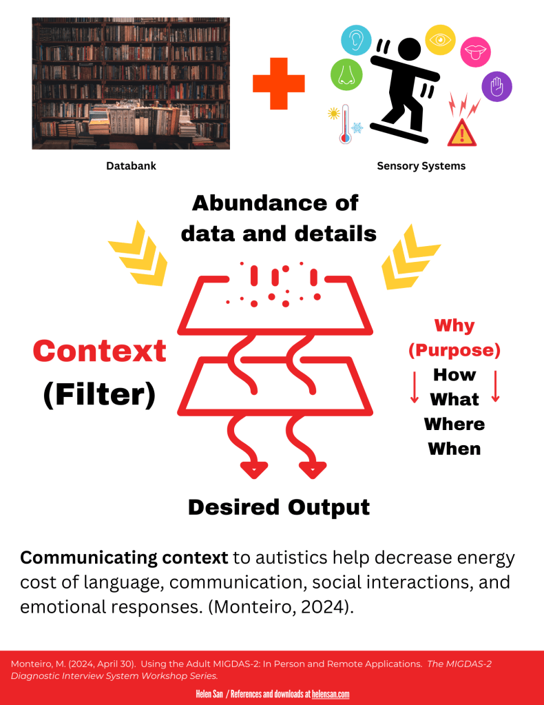 Monteiro suggests part of the reason for the cost and hard work is that the autistic brain is processing an abundance of data and details from accumulated knowledge and sensory systems. Providing context for the communication or social interaction helps the autistic brain narrow down which details to process and gives permission to ignore the rest. For example, explaining upfront, why you are telling the story and what you expect them to do with the story, gives context–a pre-fabricated filter, if you will–that shaves a huge cost of processing right off the top.