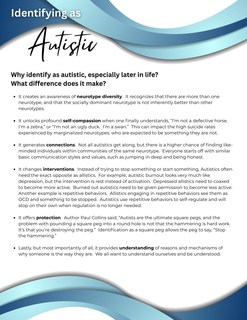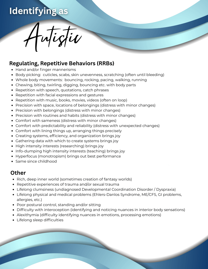 However, if you just want to know if this is your brain style and neurotype, and if autism can explain all the questions you’ve had about yourself, no one knows you better than you do. You can self-identify the way your brain works. The descriptions below can give you an idea of what to look for.